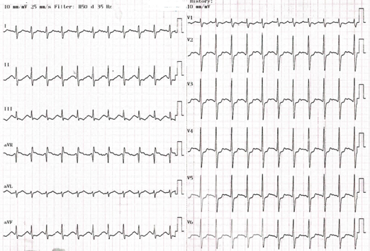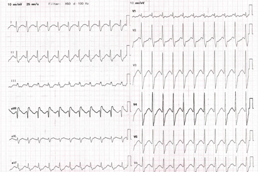 A single dose of intravenous sodium bicarbonate was administered, and a subsequent ECG revealed no further QRS widening (120 ms). Arterial blood gas (ABG) analysis showed no significant acidosis. Laboratory results indicated moderate hypokalemia with a potassium level of 3.0 mmol/L (Table Ⅰ).