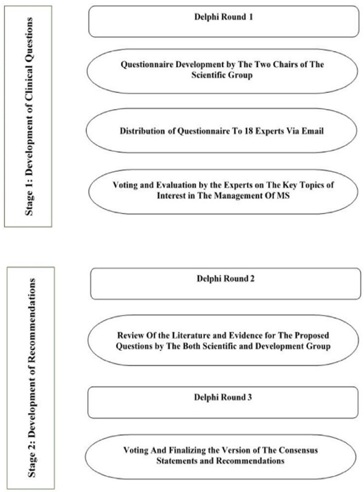 The first stage of developing the clinical questions mainly focused on creating key clinical questions to be included in the questionnaire that would guide the development of recommendations. The key topics discussed were based on evidence for early MS treatments, types of MS to be treated, identifying treatment failure, stopping and switching treatments, monitoring, effects of DMTs on cognition, special situations such as pregnancy and breast-feeding, and counselling on the safety of DMTs. Published literature was used to develop the questionnaire by the two chairs of the Scientific Group. In this process, the first round of the Delphi process was applied.
