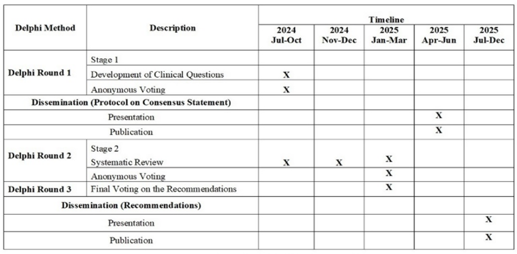 The findings were presented in an open-format meeting for discussion. The steering committee members discussed and reviewed the literature available for the identified clinical questions and anonymously voted on the final statements and recommendations. The detailed timeline and milestones of the study are presented in the Gantt Chart (Figure Ⅱ).