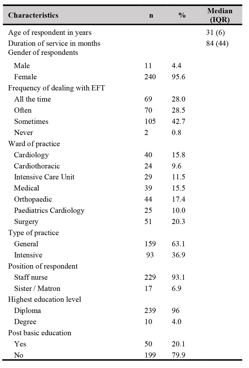 A total of 252 ward nurses participated in this study, which accounted for an estimated response rate of 61%. The demographic data of all respondents are presented in Table I. The median age of participating ward nurses was 31 years (IQR = 6), whereas the median duration of service was 84 months (IQR = 44). The majority of the participants were female (95.6%) and positioned as staff nurses (93.1%). Most of the ward nurses (99.2%) had experience in conducting medication administration via EFT, of which 28% claimed that they dealt with it all the time.
