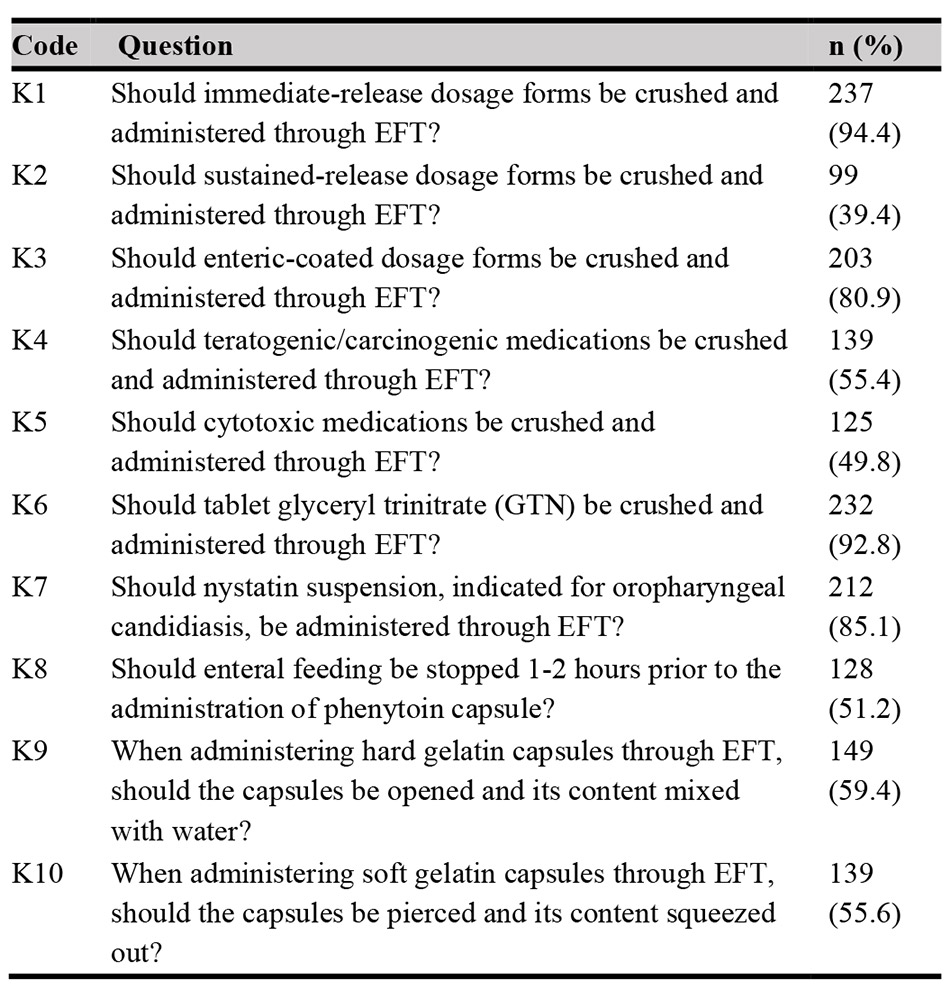 The proportion of nurses that answered correctly in the knowledge-based questions are shown in Table II. In terms of the administration through EFT, knowledge related to the proper administration of immediate-release dosage forms and GTN tablets were known best by the nurses, with 94.4% and 92.8% correct responses respectively. In contrast, knowledge related to the proper administration of the following two types of medication; sustained-release formulations and cytotoxic medications, were found to be the lowest with 39.4% and 49.8% of nurses answering with correct responses respectively.