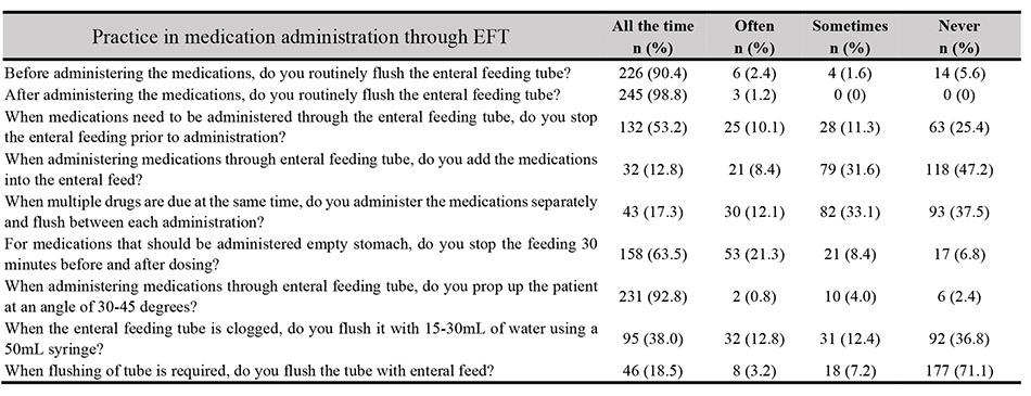 The data gathered pertaining to the practice of medication administration via EFT are shown in Table III. Most of the nurses claimed that they flush the EFT routinely before (90.4%) and after (98.8%) medication administration. The majority of nurses (92.8%) also claimed to prop up their patients all the time when administering medications to patients via EFT. However, only a small proportion of nurses (17.3%) responded that they, appropriately, administer different medications separately and flush between each administration all the time. Additionally, only half of the nurses (53.2%) would stop enteral feeding when it is time to administer medications via EFT.