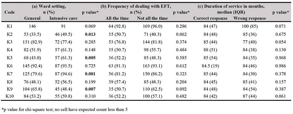 Our study revealed that nurses from the intensive care setting had more correct responses to particular knowledge-based questions as compared to those from the general ward setting (p < 0.05) as shown in Table IV. Such a finding may not be unexpected on account of the fact that a higher proportion of nurses in the intensive care setting reportedly deal with patients requiring EFT all the time (42.9%) as compared to those in the general setting (19.4%). Nevertheless, the duration of services and frequency of handling EFT did not seem to be significantly associated with their level of knowledge (refer Table IV).